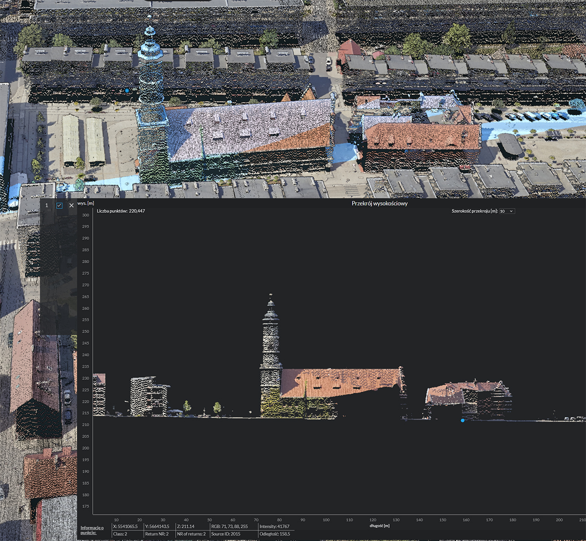 Trójwymiarowy model miasta i chmura punktów. Narzędzie to oferuje zaawansowaną wizualizację przestrzeni miejskiej w formie cyfrowego bliźniaka. System umożliwia pełną, interaktywną nawigację w widoku 3D, co pozwala użytkownikowi na swobodne przybliżanie i oddalanie obrazu oraz rotację widoku w dowolnej osi (tzw. inspekcja dookolna). Dzięki temu każdy obiekt w mieście można poddać szczegółowym oględzinom z każdej strony. Ponadto funkcjonalność ta pozwala na precyzyjne generowanie przekrojów terenu oraz natychmiastową wizualizację wysokości zabudowy i innych obiektów terenowych.